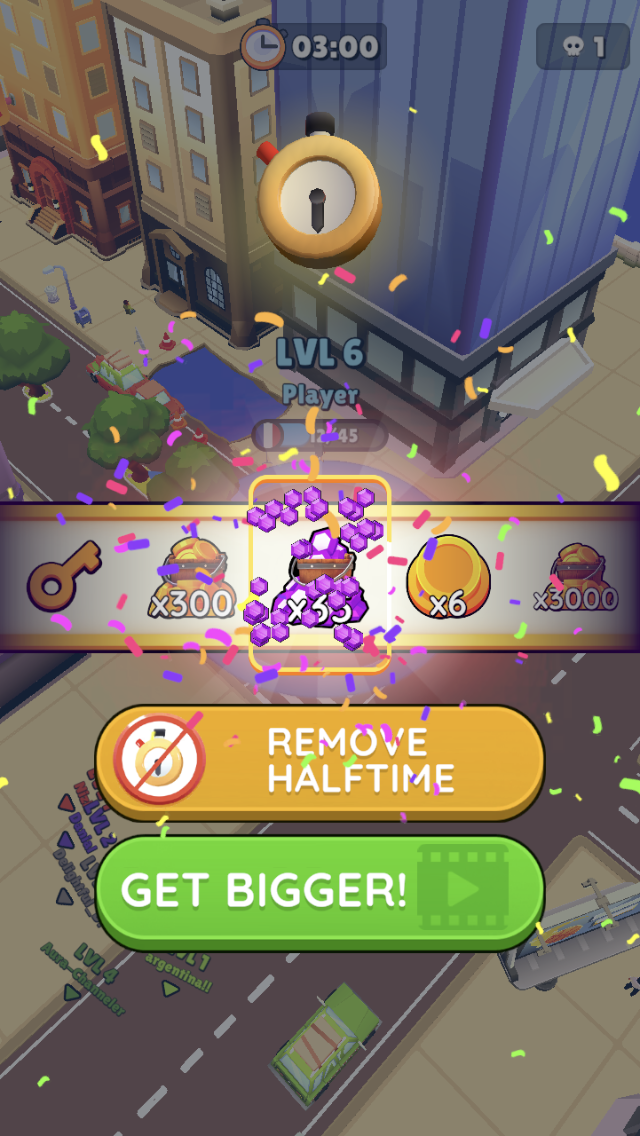 14 / 20La durée de vie de Hole.io reste correcte. Chaque fois qu’une manche s’achève, vous pouvez directement relancer une partie, à condition de visionner une publicité. On aurait cependant apprécié davantage de contenus pour prolonger l’intérêt du jeu.