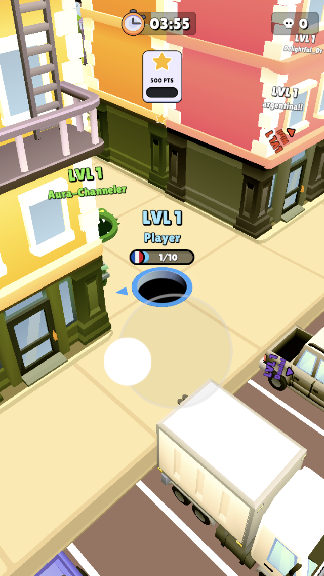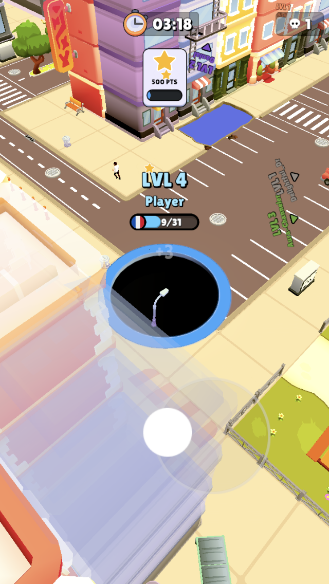 13 / 20Hole.io est un jeu très simple sur le plan graphique, avec encore quelques bugs par-ci, par-là. Vous jouez dans une ville et vous pouvez passer à travers les bâtiments dans le but de faire tomber un maximum de choses dans votre trou noir.